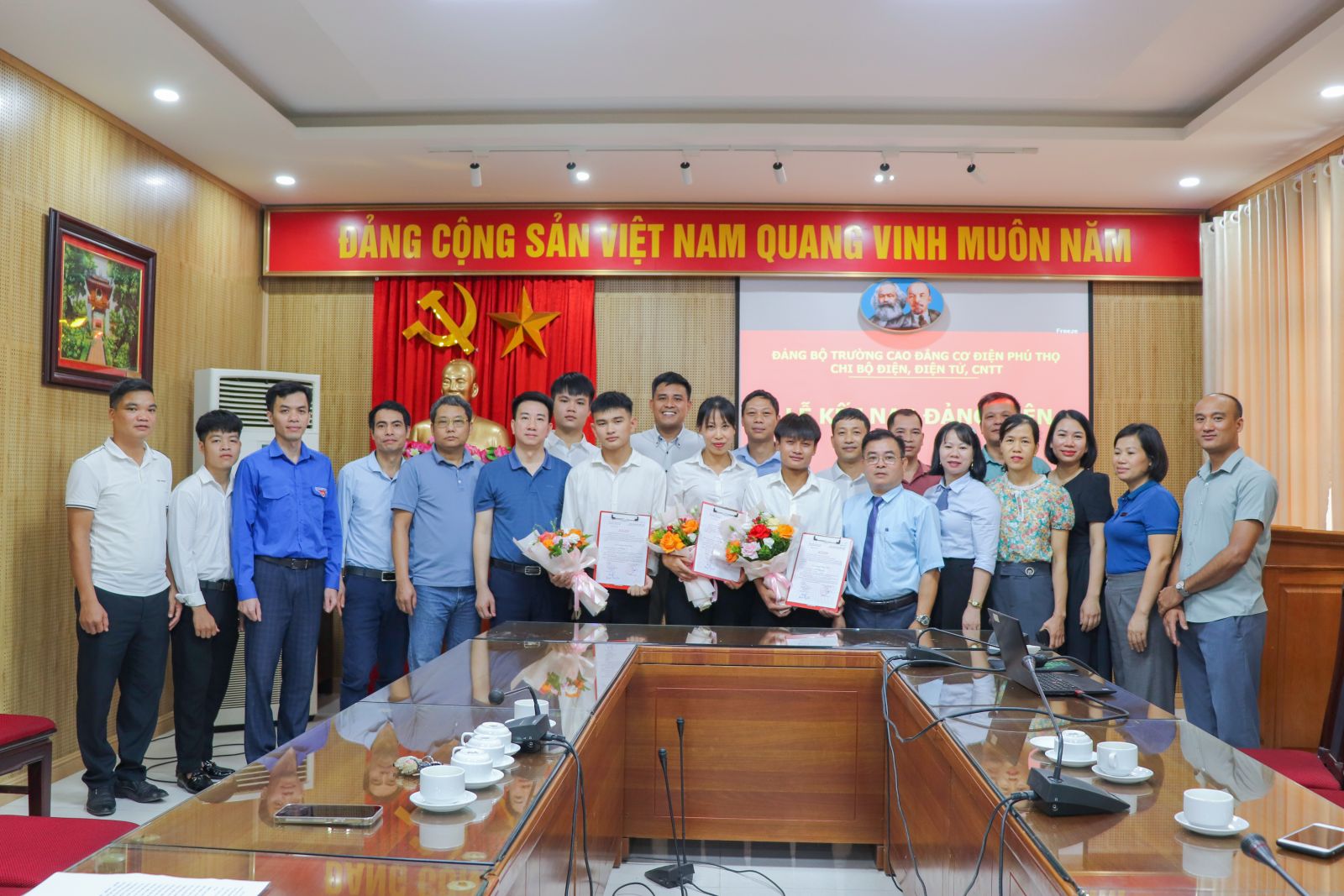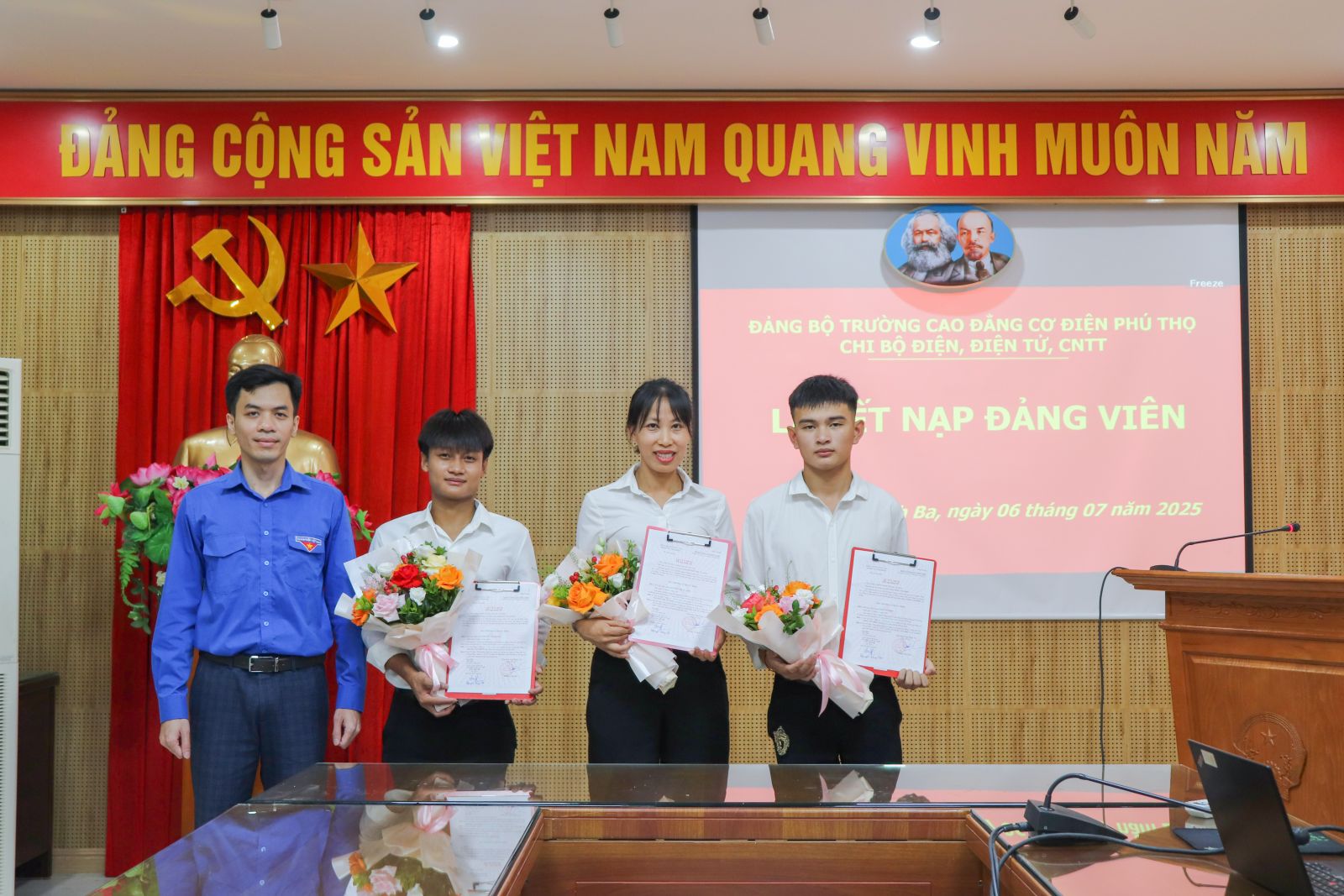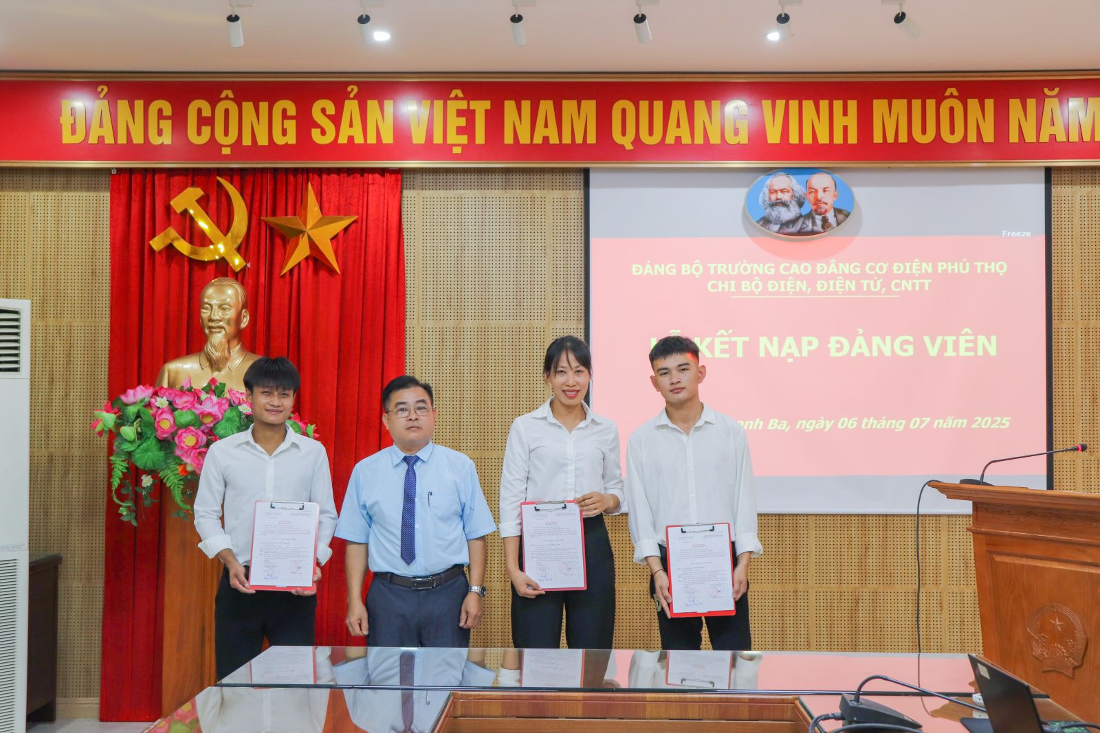 Sáng 06/7/2025, Chi bộ Điện - Điện tử - CNTT, thuộc Đảng bộ trường Cao đẳng Cơ điện Phú Thọ đã long trọng tổ chức Lễ kết nạp Đảng viên mới cho 03 Đồng chí: Nguyễn Thị Tú Linh, Hoàng Văn Hưng, Tòng Văn Điệp.