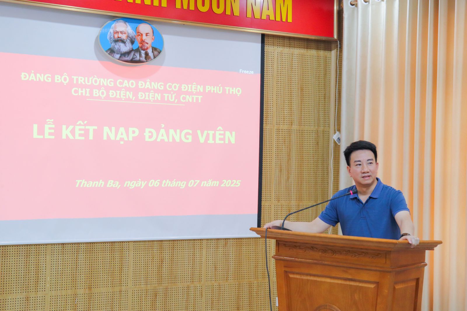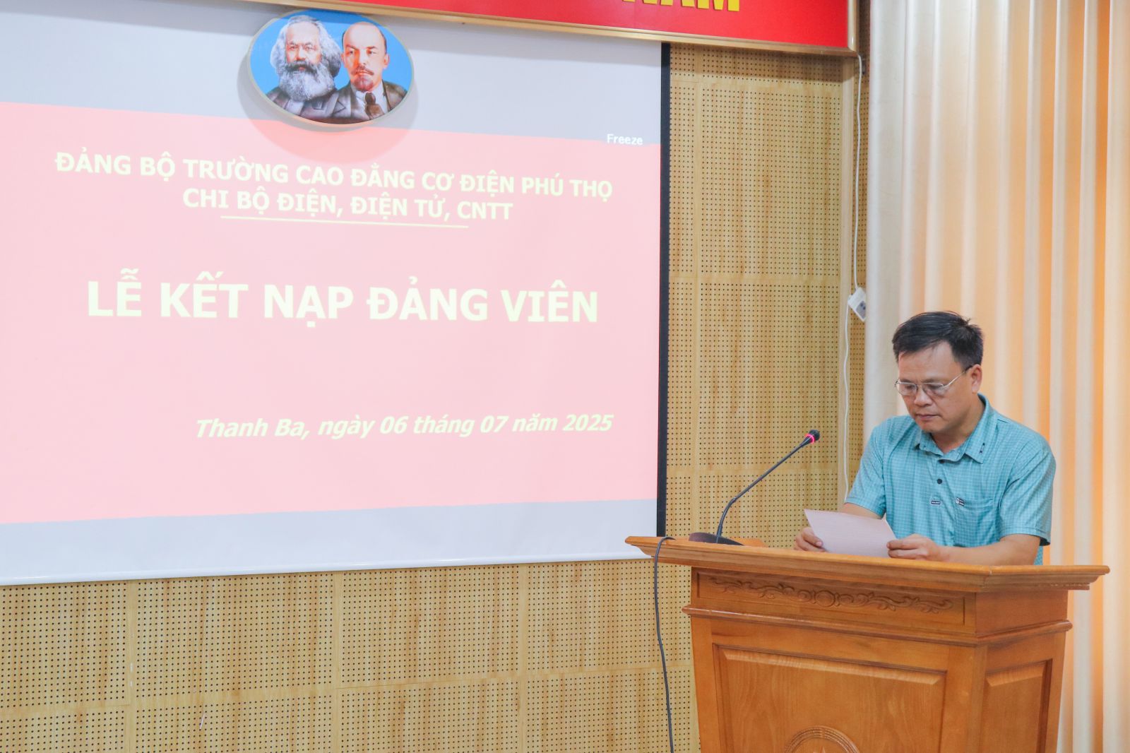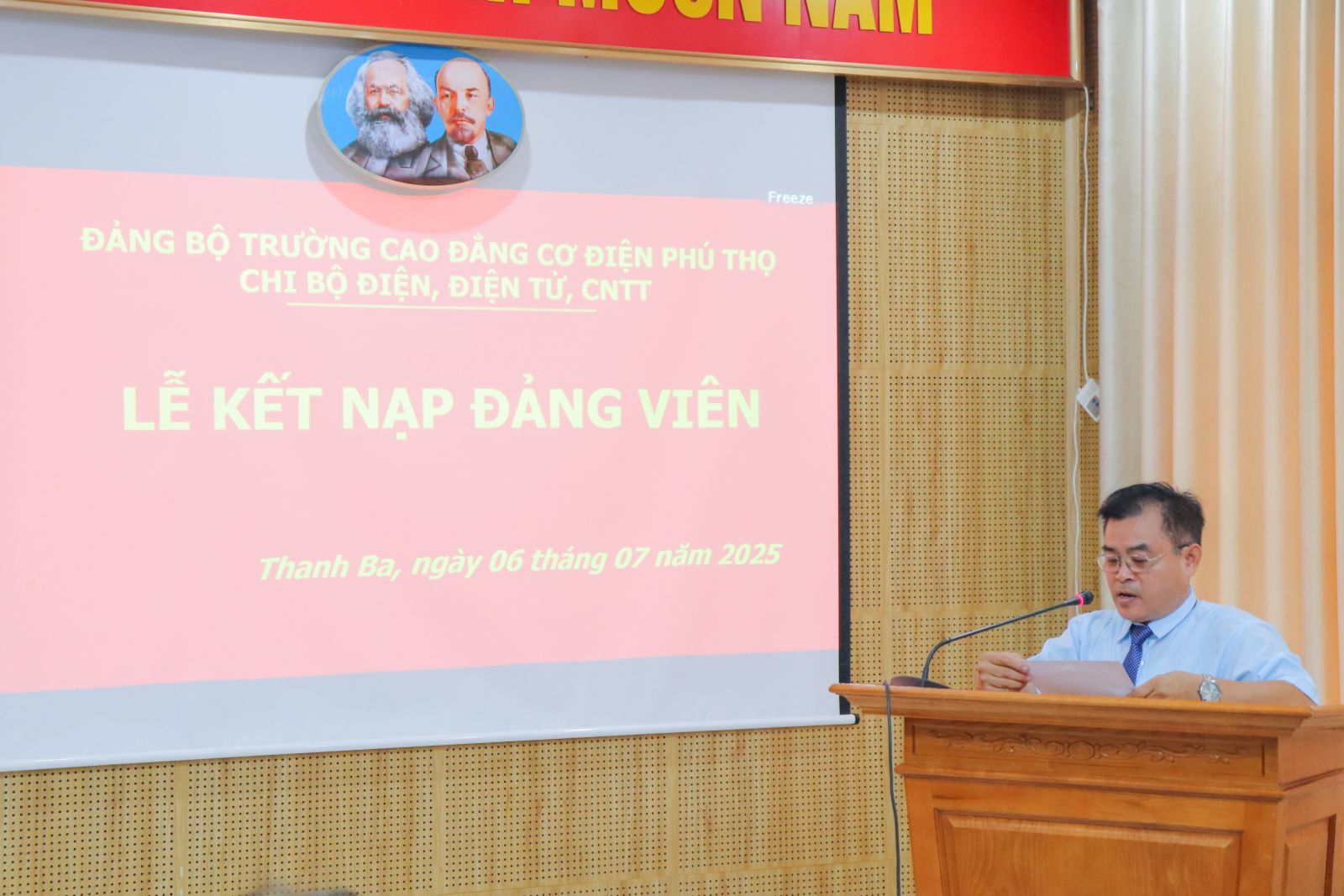 Sáng 06/7/2025, Chi bộ Điện - Điện tử - CNTT, thuộc Đảng bộ trường Cao đẳng Cơ điện Phú Thọ đã long trọng tổ chức Lễ kết nạp Đảng viên mới cho 03 Đồng chí: Nguyễn Thị Tú Linh, Hoàng Văn Hưng, Tòng Văn Điệp.