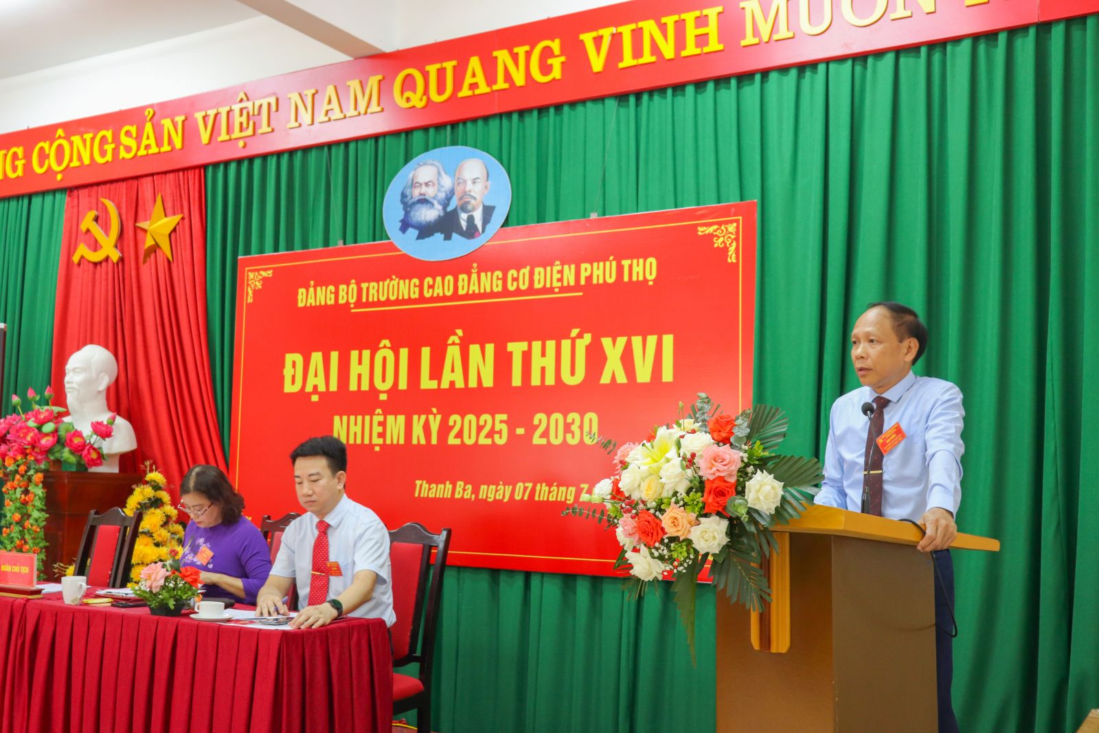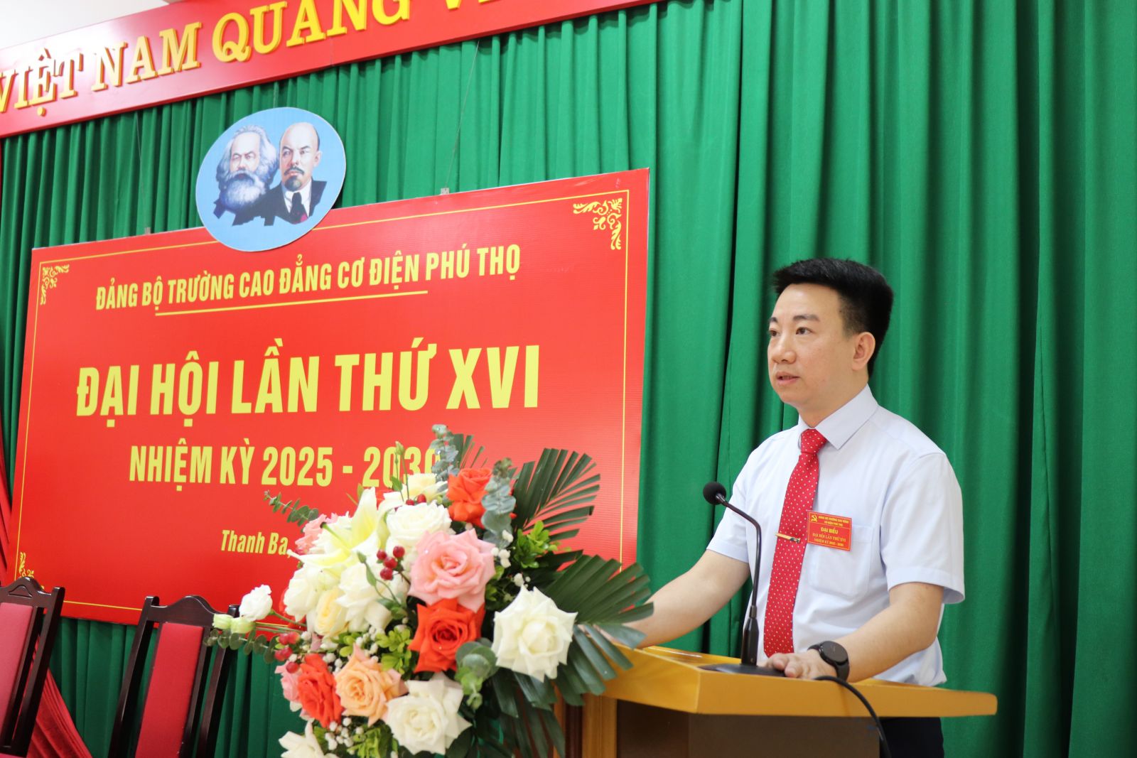 Phát biểu chỉ đạo Đại hội, đồng chí Nguyễn Văn Khai - Ủy viên BTV Đảng ủy, Phó Chủ tịch HĐND xã Thanh Ba ghi nhận, biểu dương những kết quả mà Đảng bộ Nhà trường đã đạt được trong nhiệm kỳ vừa qua. Đồng chí nhấn mạnh: trong bối cảnh đất nước đang tích cực cải cách thể chế, sắp xếp bộ máy và thực hiện nhiều nghị quyết chiến lược của Trung ương, Đảng bộ Trường cần tiếp tục đổi mới mạnh mẽ, phát huy tinh thần chủ động và thích ứng linh hoạt. Đồng chí đề nghị Đảng bộ Nhà trường cần quan tâm sâu sắc đến các nội dung trọng tâm như: nâng cao chất lượng đào tạo gắn với nhu cầu thực tiễn; đẩy mạnh nghiên cứu khoa học và chuyển giao công nghệ… nhằm đào tạo nguồn nhân lực chất lượng cao phục vụ sự nghiệp công nghiệp hóa, hiện đại hóa đất nước, đặc biệt là tại địa phương và các khu vực lân cận.